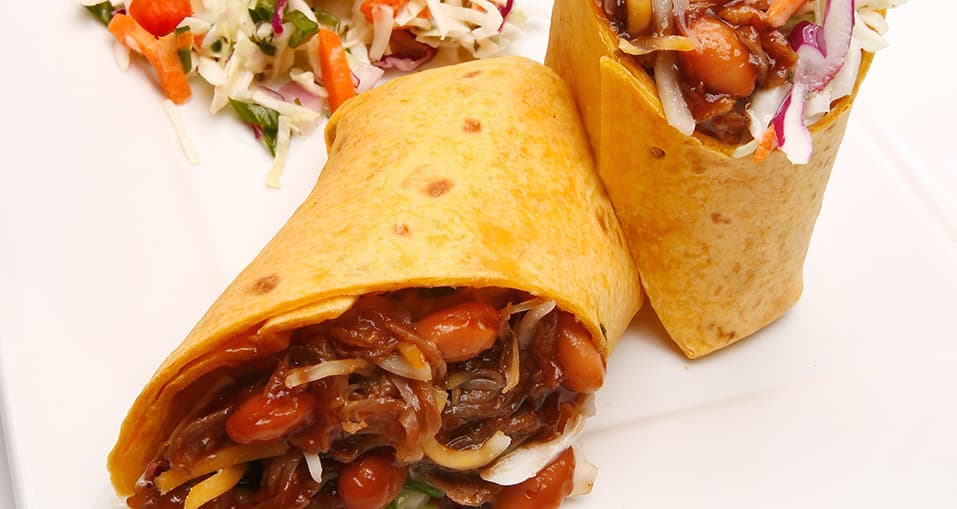 - Place the beans, cheese, pulled pork, BBQ sauce and coleslaw in the center of the wrap.